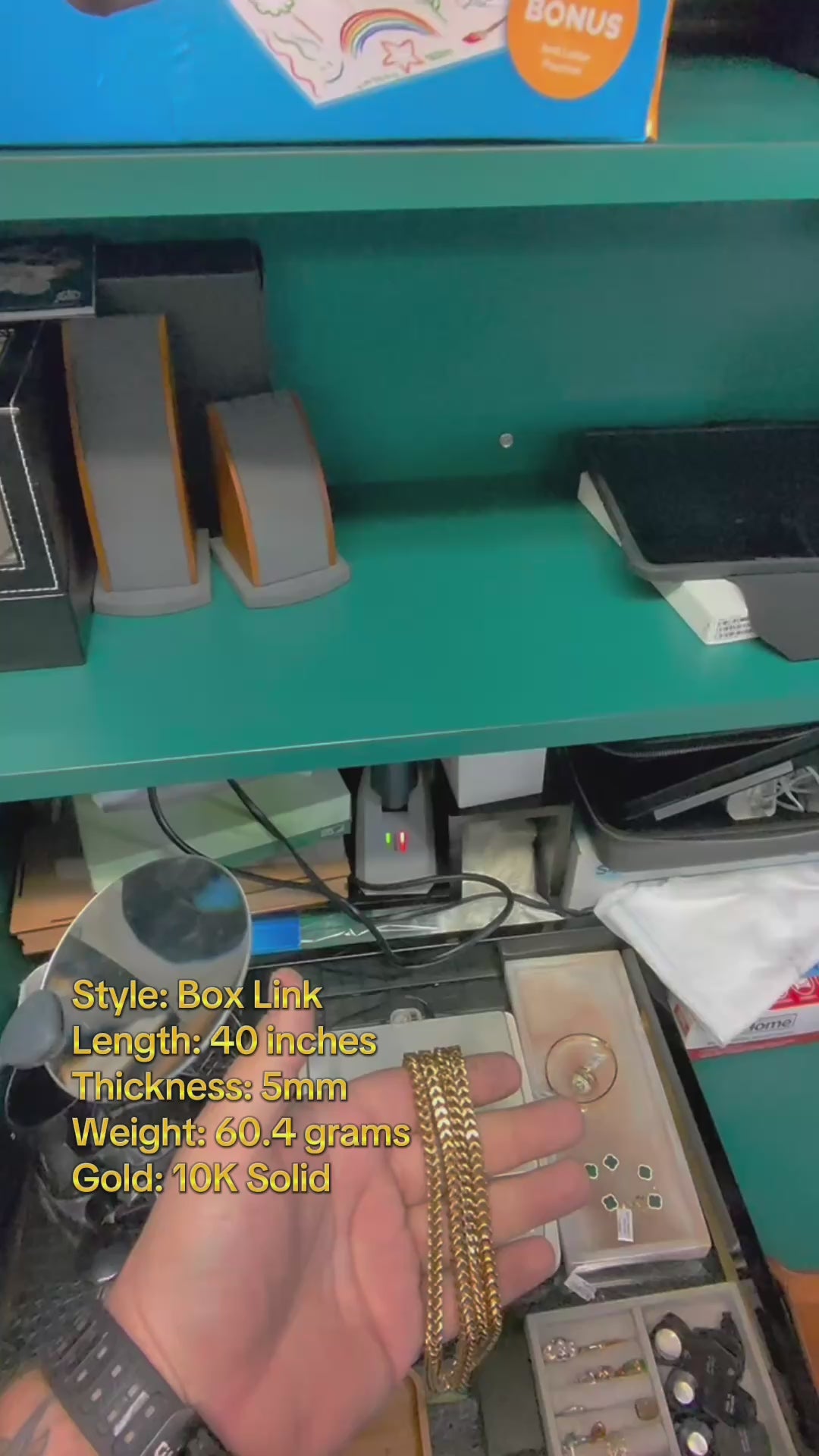 This 10K Solid Gold Box Link Chain delivers a bold, luxurious look with its 5mm thickness and extra-long 40-inch length. Weighing 60.4 grams, this piece offers a heavy, premium feel with excellent shine and durability. Perfect as a standalone statement piece or layered with other chains.